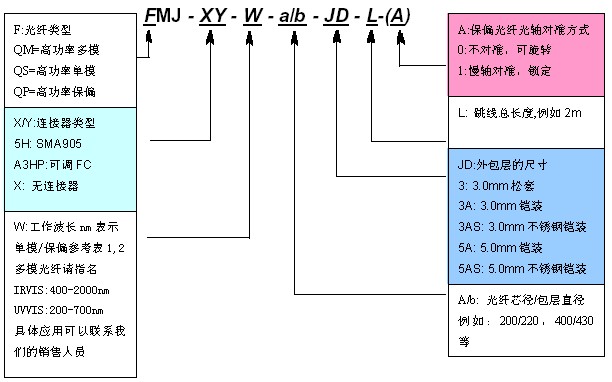 2米長,3mmPVC光纜,400/430um紅外可見高功率光纖跳線,輸入輸出端為高功率SMA905連接器。 |