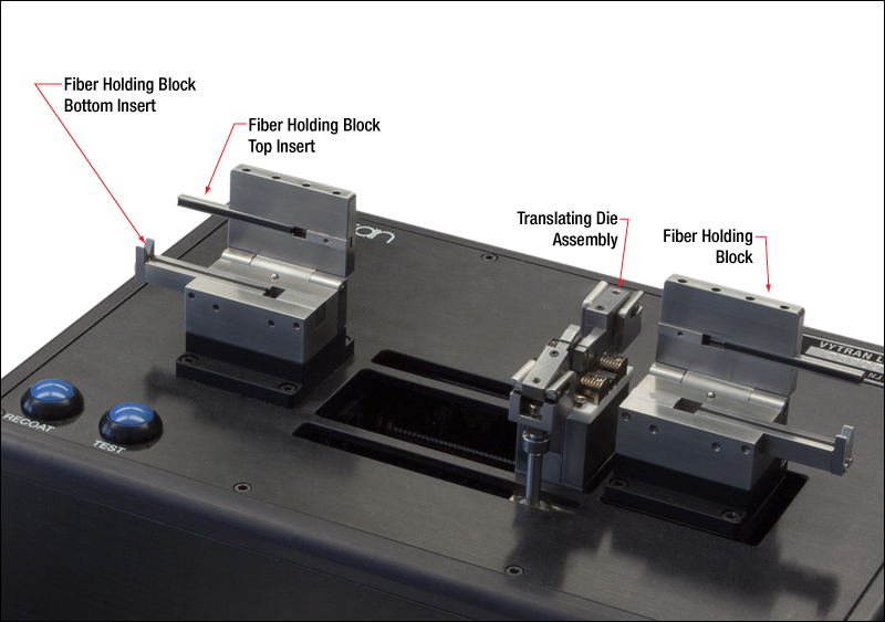 Thorlabs的PRL201聚酰亞胺光纖涂覆機(jī),圖中清除顯示了模具組件、光纖夾持座和光纖夾持插條。
