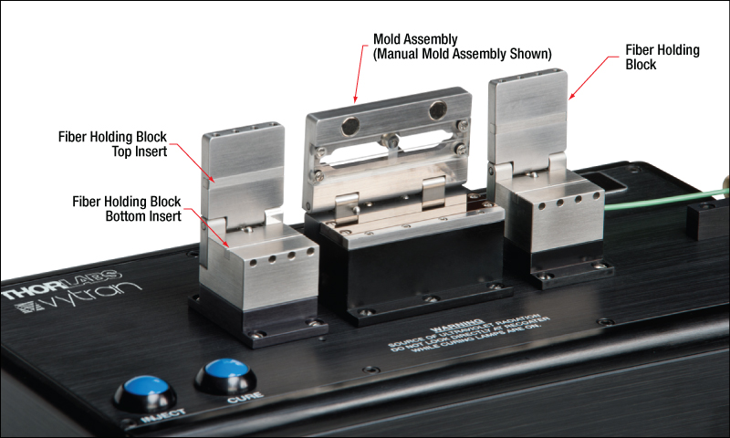 Thorlabs的光纖涂覆機,可詳細看到模具組件,光纖夾持座和光纖座的插條。