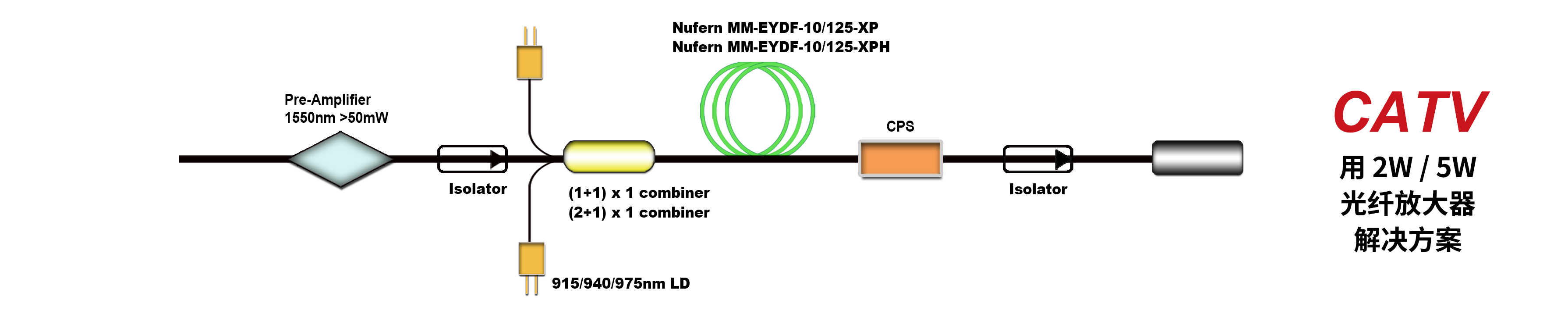 EDFA的出現(xiàn),解決了光纖通信網(wǎng)絡(luò)中損耗對于信號傳輸距離的限制,使長距離光纖通信成為現(xiàn)實。EDFA 工作窗口位于光纖低損耗區(qū),具有增益帶寬大、噪聲系數(shù)小、系統(tǒng)性能穩(wěn)定以及技術(shù)成熟等優(yōu)點,但是隨著密集波分復(fù)用系統(tǒng)傳輸速率越來越高,單根光纖復(fù)用信道數(shù)目越來越多,導(dǎo)致普通的摻鉺光纖放大器(飽和輸出功率幾百 mW)難以滿足 DWDM 系統(tǒng)對于放大器輸出功率的要求;另外,隨著光纖到戶系統(tǒng)(FTTH)和光纖 CATV 技術(shù)的推廣,由于用戶數(shù)量眾多,需要在光纖鏈路終端放置光纖放大器進(jìn)行功率補償和分配。由于傳統(tǒng)的 EDFA 輸出功率偏小,目前多采用 EDFA 級聯(lián)的方式,影響了整個系統(tǒng)的信號質(zhì)量,增加了建設(shè)和維護成本。而輸出功率達(dá)到 1W 級以上的高功率光纖放大器(EYDFA),將在今后CATV的市場中得到越來越廣泛的應(yīng)用,因為它可替換系統(tǒng)中級聯(lián)的 EDFA,提高了系統(tǒng)信號傳輸?shù)馁|(zhì)量,有效的實現(xiàn)了信號超遠(yuǎn)距離的傳輸,節(jié)約了系統(tǒng)建設(shè)和運營成本。上海瀚宇具有超過10年高功率光纖放大器制作的專業(yè)經(jīng)驗,對雙包層光纖技術(shù)具有深刻的理解能力,同時有著多項雙包層光纖放大的優(yōu)秀技術(shù),將持續(xù)可為CATV市場的客戶提供高性價比的產(chǎn)品和解決方案,大幅度降低EYDFA成本。
