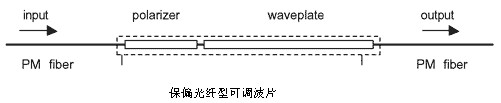 保偏光纖型可調(diào)波片這種結(jié)構(gòu)的光纖波片包含了一個(gè)光纖偏振器,偏振器被集成在波片的前端,并且和輸入保偏光纖的慢軸對(duì)準(zhǔn).該光纖偏振器的作用是用來”凈化”輸入的線性偏振態(tài),輸出為保偏光纖.這種器件使得輸出的偏振態(tài)能夠覆蓋整個(gè)大邦加球循環(huán)(the great circle on the Poincare sphere),輸出光纖的偏振態(tài)可以被改變?yōu)樽笮龍A偏振(left circular),右旋圓偏振(right circular),和正交線性偏振態(tài)(orthogonal linear states). 如下圖所示: