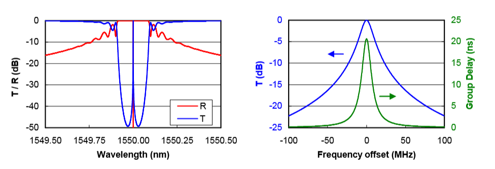 PureSpectrum NLL激光器的核心是“線寬壓窄系統(tǒng)”,而該系統(tǒng)的核心器件是極窄線寬的光學(xué)濾波器作為鑒頻器(Frequency Discriminator)。TeraXion公司采用具有π相移的光纖光柵(π phase shifted FBG)作為光學(xué)鑒頻器。這樣的光纖光柵可以被看做是一個(gè)具有極窄線寬的光學(xué)濾波器,間距極窄的光纖光柵型F-P無源諧振腔。