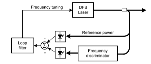 DFB型半導(dǎo)體激光器發(fā)出的激光被小分光比光分路器分出一部分,用于分析輸出光頻率的波動(dòng),鑒頻器(Frequency discriminator)作為一個(gè)關(guān)鍵器件用于“識(shí)別”激光的頻率波動(dòng),經(jīng)過平衡探測(cè)器,將頻率的波動(dòng)轉(zhuǎn)換成強(qiáng)度波動(dòng),獲取“誤差信號(hào)”,然后經(jīng)過環(huán)路濾波器,移相電路,放大電路等閉環(huán)控制電路加載到DFB激光器的驅(qū)動(dòng)偏置電路上,最終實(shí)現(xiàn)對(duì)輸出激光頻率的跟蹤鎖定。總體思想是通過穩(wěn)定輸出激光的瞬時(shí)頻率波動(dòng)的方式降低DFB半導(dǎo)體激光器的頻率噪聲,從而“壓窄”了DFB半導(dǎo)體激光器的線寬。