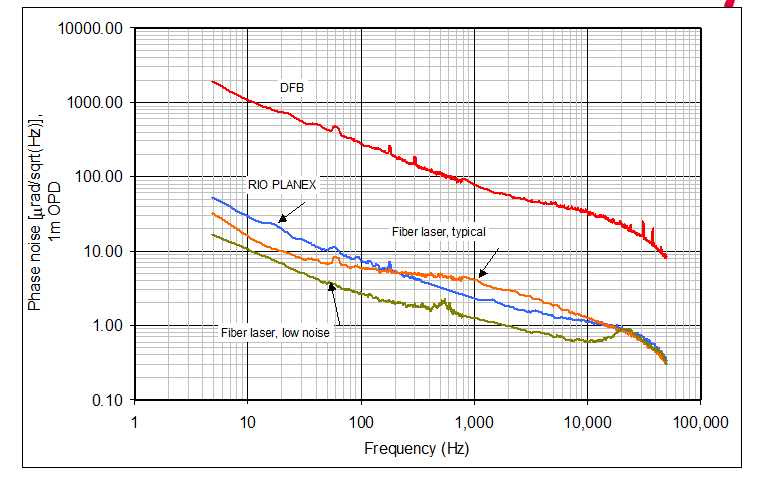 RIO公司早期的測試相位噪聲測試結果顯示,PLANEX單頻半導體激光器的相位噪聲遠遠優(yōu)于普通的DFB半導體激光器,比單頻光纖激光器要差。這符合常識,單頻光纖激光器因為諧振腔長度遠遠大于單頻半導體激光器,能夠實現(xiàn)獲得更低的相位噪聲和頻率噪聲,頻譜的線寬也會更窄。