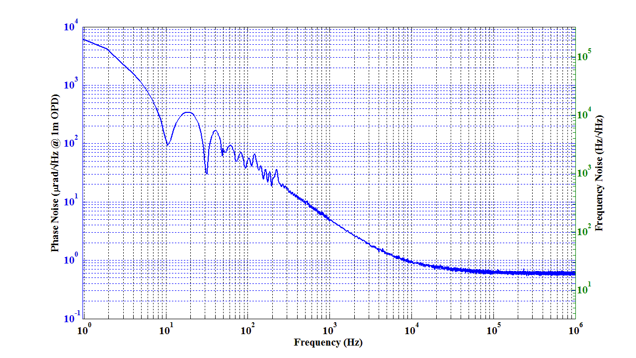 我們測試的是最高性能的ORION單頻半導體激光器,根據RIO提供的技術指標,其相位噪聲為2urad/rt-Hz@1m OPD,頻譜線寬<1kHz (Lorentian).上海瀚宇的測試結果如下: