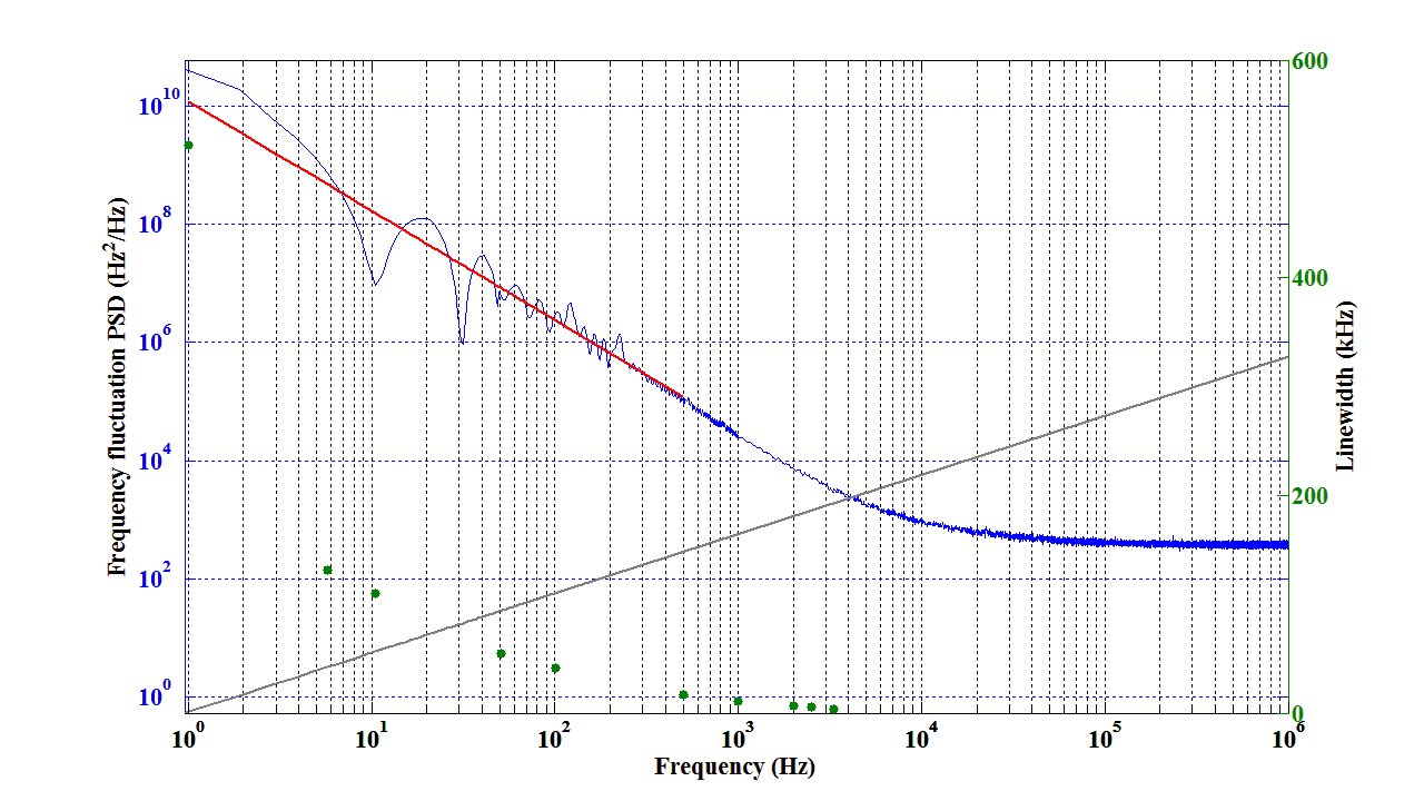 受限于測試設備的分辨率和測試條件,我們測得的線寬略高于1kHz,相信該激光器的實際線寬和RIO公司的指標比較接近。