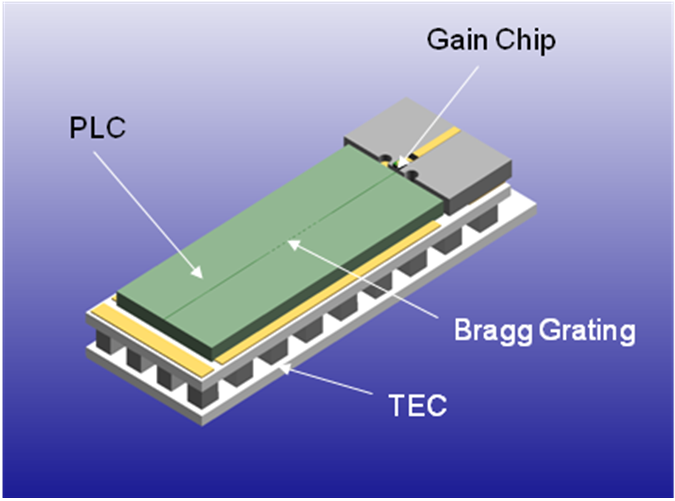 PLANEX單頻半導體激光器是一個獨特的集成硅光子平臺,基于磷化銦(InP)Fabry-Perot(FP)增益芯片和硅基平面光波導(PLC)上制作的專有布拉格光柵的混合集成,形成了非常穩(wěn)定和高性能的激光器腔,顯然這是一種外腔激光器(ECL),眾所周知,外腔技術在單頻半導體激光器上被廣泛采用,通過外腔的設計,增加半導體激光器的諧振腔長度,專有設計的在平面光波導上制作的布拉格光柵對FP增益芯片發(fā)出的多縱模激光形成一定程度的若反射,反射光注入到FP增益芯片的激光器諧振腔中,干擾震蕩的縱模模式,在滿足一定相位匹配的條件下,實現(xiàn)了穩(wěn)定的窄線寬輸出,布拉格光柵的反射帶寬決定了PLANEX激光器的輸出光譜寬度。