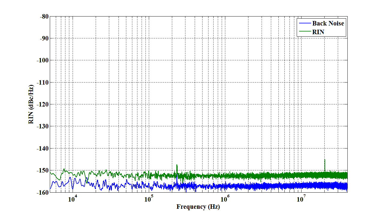ORION單頻半導體激光器的相對強度噪聲(RIN)非常出色,RIO公司的典型測試結果顯示,其相對強度噪聲在小于1kHz的低頻部分主要受1/f噪聲影響。
