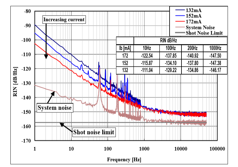 超過2kHz以后,相對強度噪聲低于-140dB/Hz甚至-150dB/Hz的水平。根據RIO公司的估計,ORION單頻半導體激光器的馳豫振蕩峰值頻率可能高達8GHz,從kHz低頻段一直到GHz高頻段都有比單頻光纖激光器更低的RIN。其中,一個有趣的現(xiàn)象是,隨著驅動電流的加大,ORION的相對強度噪聲整體水平呈下降趨勢,但是超過1kHz時會收斂,RIO公司認為目前的測試系統(tǒng)無法解釋這樣的收斂。我個人認為,這是半導體激光器的特性所致。