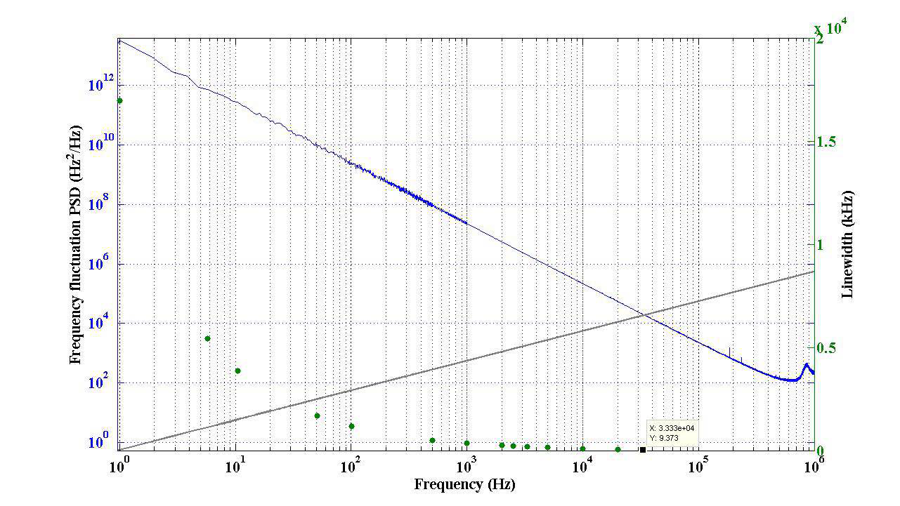 左側(cè)的縱坐標(biāo)是頻率噪聲功率譜密度,,右側(cè)的縱坐標(biāo)是線寬。一個(gè)個(gè)分布的小圓點(diǎn)就對(duì)應(yīng)了被測(cè)單頻激光器在不同積分時(shí)間情況下的線寬,當(dāng)然這樣的線寬結(jié)果是通過(guò)一系列相對(duì)復(fù)雜的算法計(jì)算得出的。完全可以想象,不同的測(cè)試儀器廠家的算法邏輯可能會(huì)有差別,所以得到的線寬結(jié)果也會(huì)有所區(qū)別。