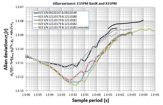單頻光纖激光器的頻率噪聲指的是單頻激光場矢量的瞬時頻率的隨機抖動。在時域有用于描述頻率相對波動的阿倫偏差(Allan Deviation),實現(xiàn)方法是通過阿倫方差(Allan Variance)分析。下面的測試結(jié)果來自于NKT Photonics,圖中的橫坐標(biāo)為取樣的時間,縱坐標(biāo)就是阿倫偏差,包括公式,有興趣的同學(xué)可以自行研究理解。