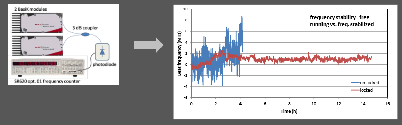 在時域,大家更習(xí)慣于引入相對較長時間內(nèi)的頻率穩(wěn)定度來衡量單頻光纖激光器的頻率穩(wěn)定性,通過頻率漂移的大小來判斷單頻光纖激光器的波長穩(wěn)定性能,例如,經(jīng)過穩(wěn)頻的光纖激光器的頻率穩(wěn)定度為1x10-9,或者10MHz/hour這樣的指標(biāo),看起來很直觀。下圖展示的是NKT公司通過兩個單頻光纖激光器拍頻測試得到的隨著時間變化的頻率穩(wěn)定性。顯然這是一個長期的頻率穩(wěn)定性的表征。