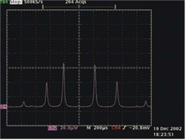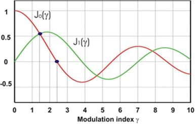 邊帶的振幅由貝塞爾(Bessel)函數(shù)決定,并且由調(diào)制系數(shù)控制。載波抑制能夠得到一個(gè)調(diào)制系數(shù) 2.4,相對(duì)于第一個(gè)載波振幅系數(shù) Jo(γ),邊帶振幅是 J1(γ) 。
