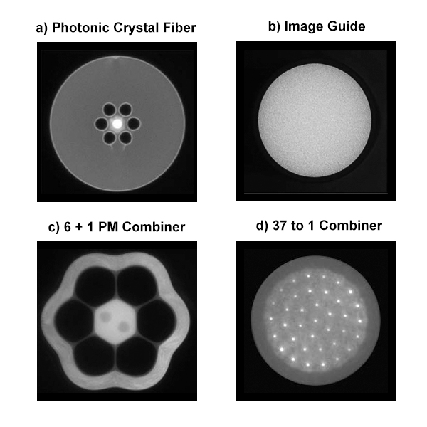 圖分別為a)光子晶體光纖,b)光纖傳像束,c) 6+1保偏光纖合束器,d)37轉(zhuǎn)1光纖合束器。