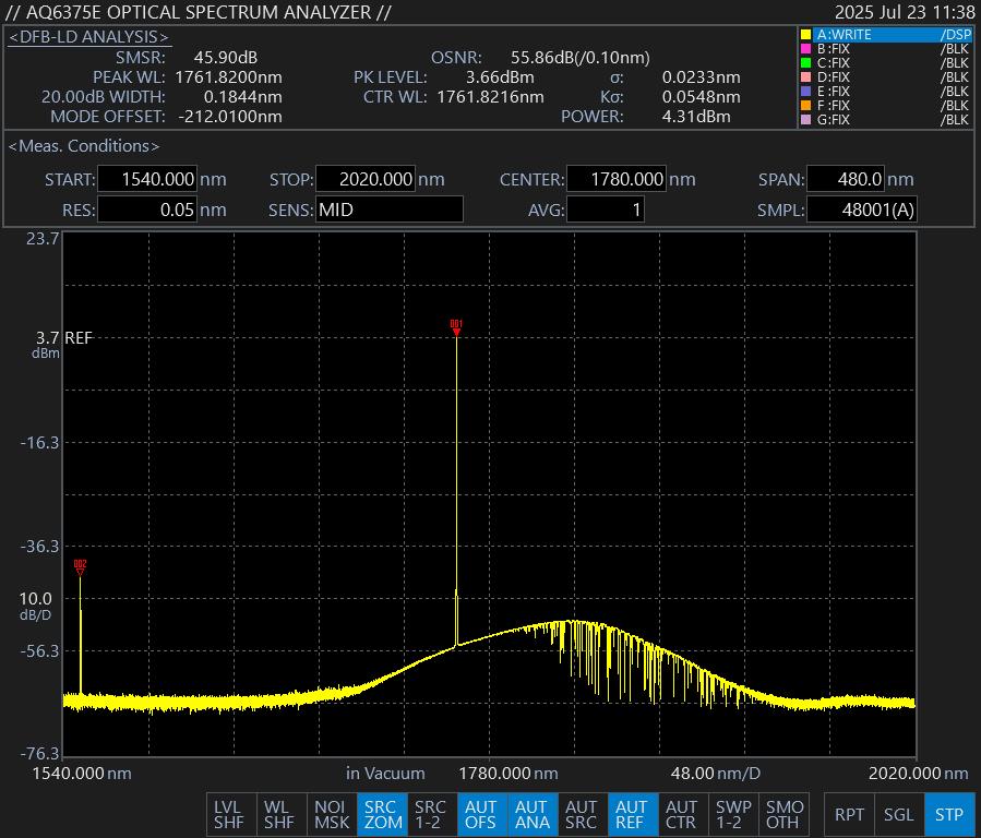此光譜未截止濾除1550nm泵浦光,截止濾除后1762nm邊模抑制比SMSR可達60dB以上。
