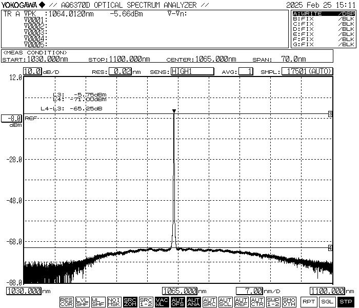 ▲ 圖1:1064nm輸出光譜 ▲ 圖2: 1064nm輸出線寬