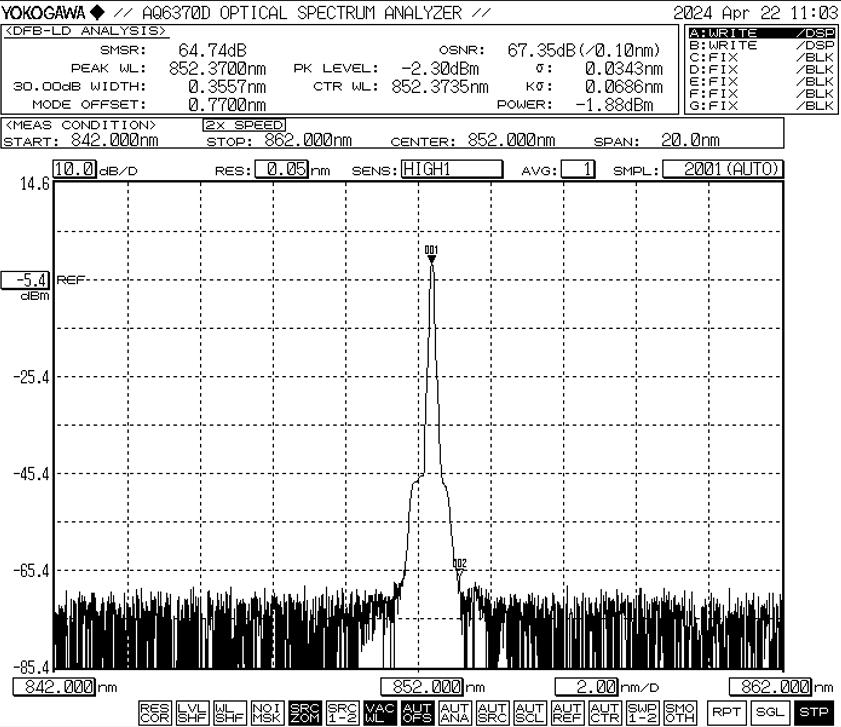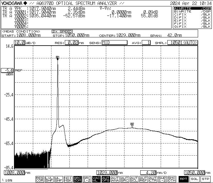 ▲ 852nm輸出光譜圖 ▲ 1018nm基頻光輸出光譜圖