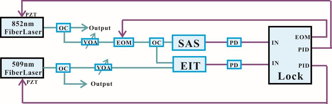 上海瀚宇的852/509nm雙路鎖頻激光系統(tǒng)主要包括852nm單頻激光器模塊、509nm單頻激光器模塊、鎖頻電路模塊、相位調(diào)制器(EOM)、飽和吸收譜(SAS)裝置、EIT裝置及相應(yīng)的光纖分束器件(OC)和功率調(diào)節(jié)器件(VOA)等部分組成。整個(gè)系統(tǒng)全部采用保偏光纖器件連接,852nm激光使用MTS或FMS鎖頻方案,509nm激光利用EIT譜鎖定,激光器的控制及鎖定全部基于上位機(jī)軟件實(shí)現(xiàn)。